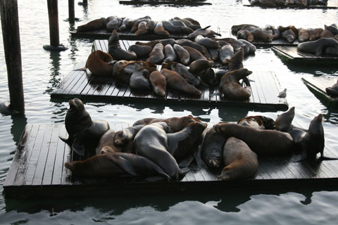 (右下) 900頭近くいる埠頭のアシカ。鳴き声の大合唱が圧巻です。