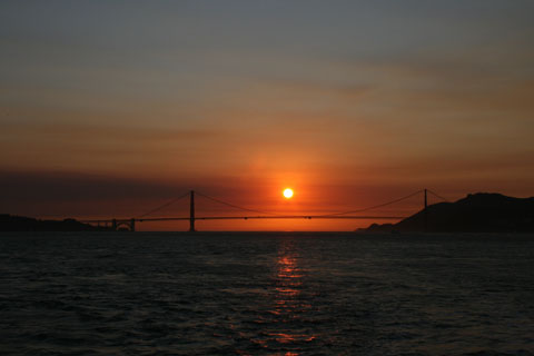(左下) クルーズの船上から眺めるゴールデンゲートブリッジと夕陽。
