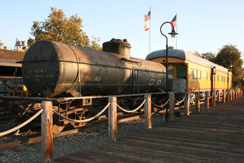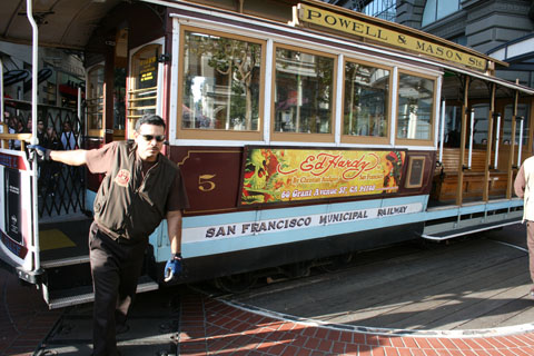 (左上) 名物のケーブルカー。折り返しのために人が車体をまわしています。