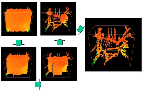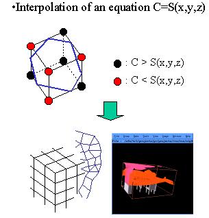 Suppose that we are thinking of where to put an heater in the room. If you want to keep the room at 26 degrees centigrade, You should want to see which area is 26 degrees. You can see such an area by generating an isosurface regarding the constant value C as 26. In a typical implementation, vertices of an isosurface is assigned on edges of cells by the linear interpolation between values of two vertices of the edges. A polygon inside a cell is generated by connecting the vertices. Isosurface is generated by applying the process to all cells in a volume. |