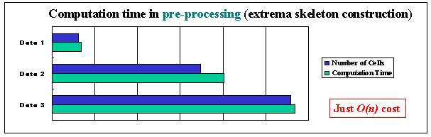 The following graph shows the number of cells in three volumes and computation times for constructing extrema skeletons for the three volumes. It denotes that the computation time is almost proportinal to the number of cells. It is natural because the extrema vertices extraction process visits each vertex once, and the volume thinning process visits each cell once. |