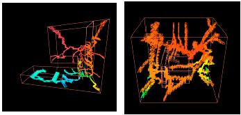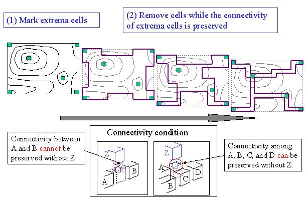| We applied the volume thinning method to form an extrema skeleton. The method first marks cells adjacent to extrema vertices, and then removes many cells out of the process, while it preserves the connectivity between the marked cells. Finally an extrema skeleton that connects all the extreama vertices is formed. Isosurface cells of every isosurfaces can be always found from the skeleton. |
