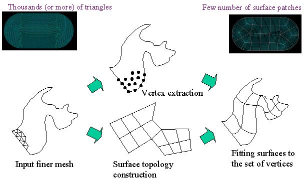 | To convert the fine triangular mesh into coarse surface patches, our implementation first constructs the topology of quadrilateral patches. Then, it regards the vertices of the triangular mesh as a set of unorganized points, and fits the quadrilateral patches into the set of points by using the least-square-based interpolation. |