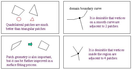 We experimentally found that the smoothness and continuity of surface patches strongly depens on their topology. The following is the requirements for the topology we found in our try-and-error. All four requirements are important, but we think that the topology along the domain boundary is especially critical in the view of the quality of surfaces. |