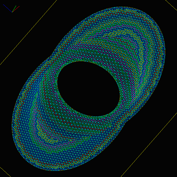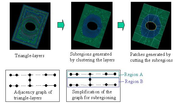 | To generate the topology of surface patches like those of meshes generated by the advancing front method, our implementation first generates several belt-like subregions along the domain boundary, by clustering triangular elements. It first generates a set of one-element-width layers, and constructs a graph of the layers. Then it merges many of the layers to form several subregions. The process corresponds to the simplification of the layer graph. The following is an example of subregion generation. The implementation generates only two subregions from about 50 of one-element-width layers, and generates quadrilateral patches by cutting the subregions. |