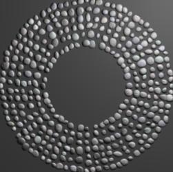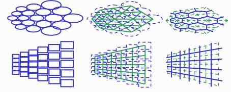 Left shows an example of tightly packed circular or rectangular particles. Our technique assumes that each particle has molecular-like dynamics, which works as attractive or repulsive forces. By applying dynamics equation of particles, our technique obtain a stable configuration of particles. We use rectangular particles as pattarns of stone pavements. Center shows an example of triangular or quadrilateral mesh connecting centers of the particles. Rights shows an example of hexagonal or quadrilateral patterns used as patterns of skins of reptiles, which are obtained as Voronoi diagram of the triangular or quadrilateral mesh. |