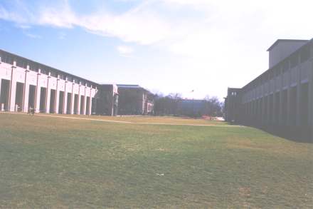 | これはカーネギーメロン大学の正面玄関です。 といっても、この大学には門もドアもないですが。 この大学はアメリカでは狭い大学の部類に入るのですが、 それでも正面には一面の芝生が敷かれ、 贅沢なレイアウトが優雅な印象を与えています。 左側のビルは学生施設(売店、喫茶、スポーツ施設)が中心で、 右側のビルは事務室が中心です。その奥にキャンパスが並んでいます。 |