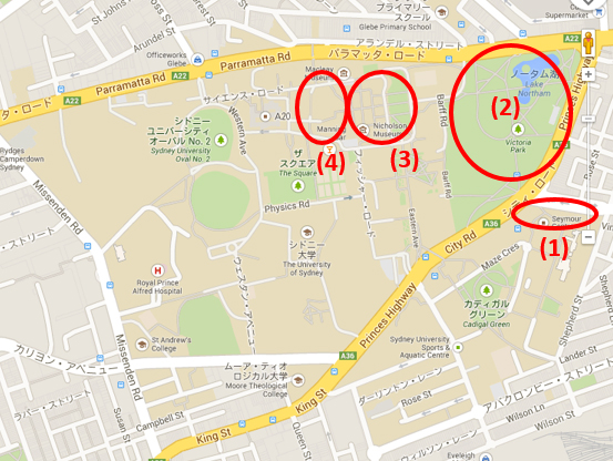 下の地図はシドニー大学近辺の地図で、薄茶色に塗られた領域が大学の敷地となっています。