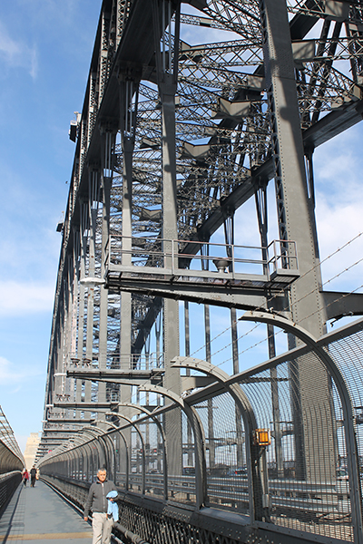 写真はハーバーブリッジを北側から眺めているところ(オペラハウスが遠くに見えます)と、橋を歩いて南側の中心街に戻る途中です。