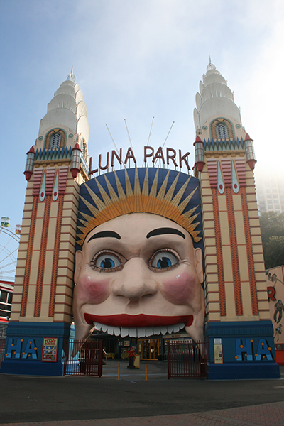 大きな顔の写真は、ハーバーブリッジの北側にあるルナパークという遊園地の入り口です。この美的感覚は私には何とも言えません…。
