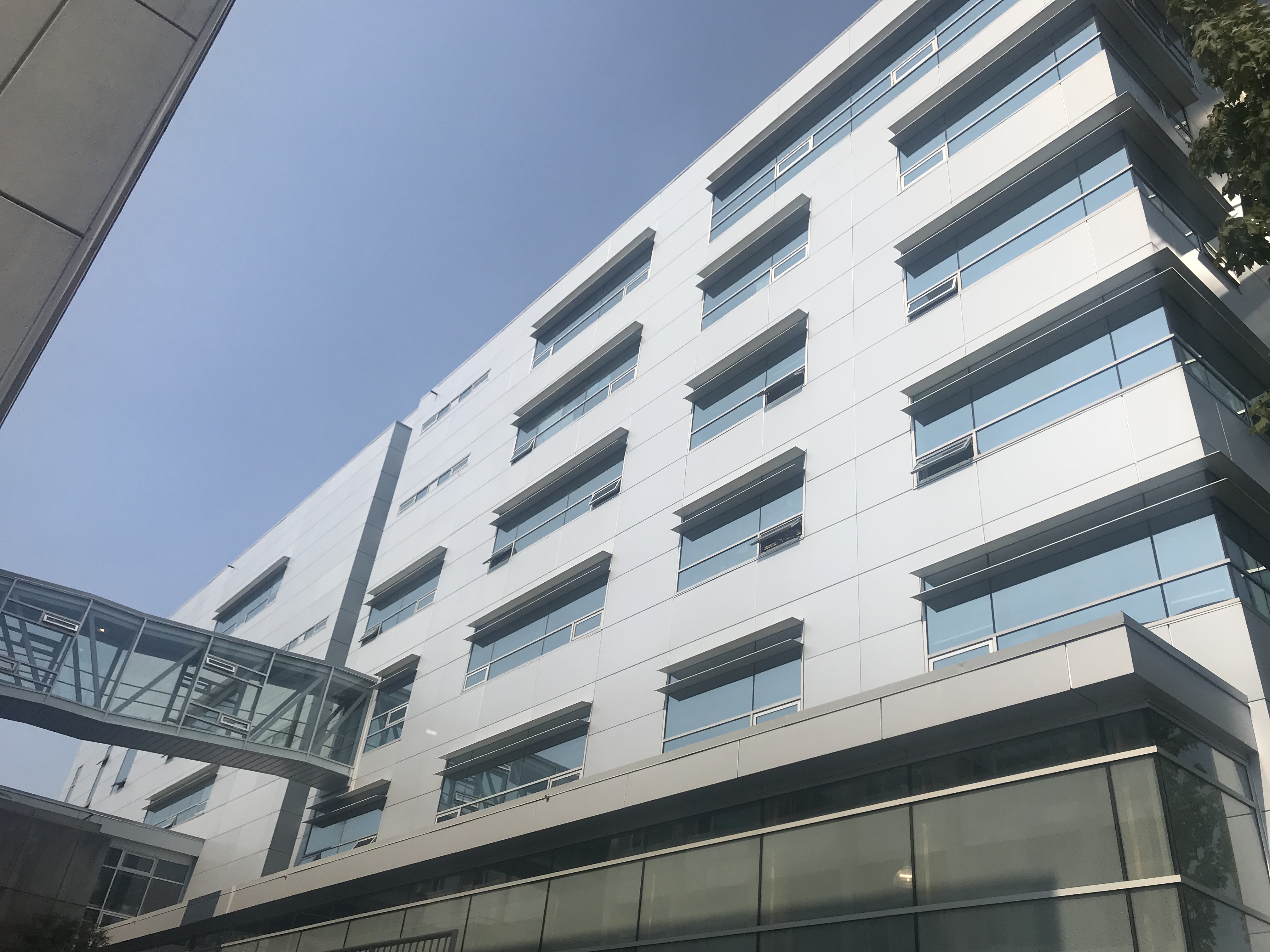 このビルを裏通りから見ると2つのウィングに分かれています。 手前のウィングは7階建て、奥のウィングは6階建てなのですが、どちらもほぼ同じ高さです。 よく見ると、手前のウィングの最上階2階ぶんと、奥のウィングの最上階1階ぶんが、ほぼ同じ高さになっています。 手前の最上階は6階と8階、奥の最上階は7階と名付けられています。 あまりに紛らわしくて、しばらくビルの構造を理解できませんでした。 |