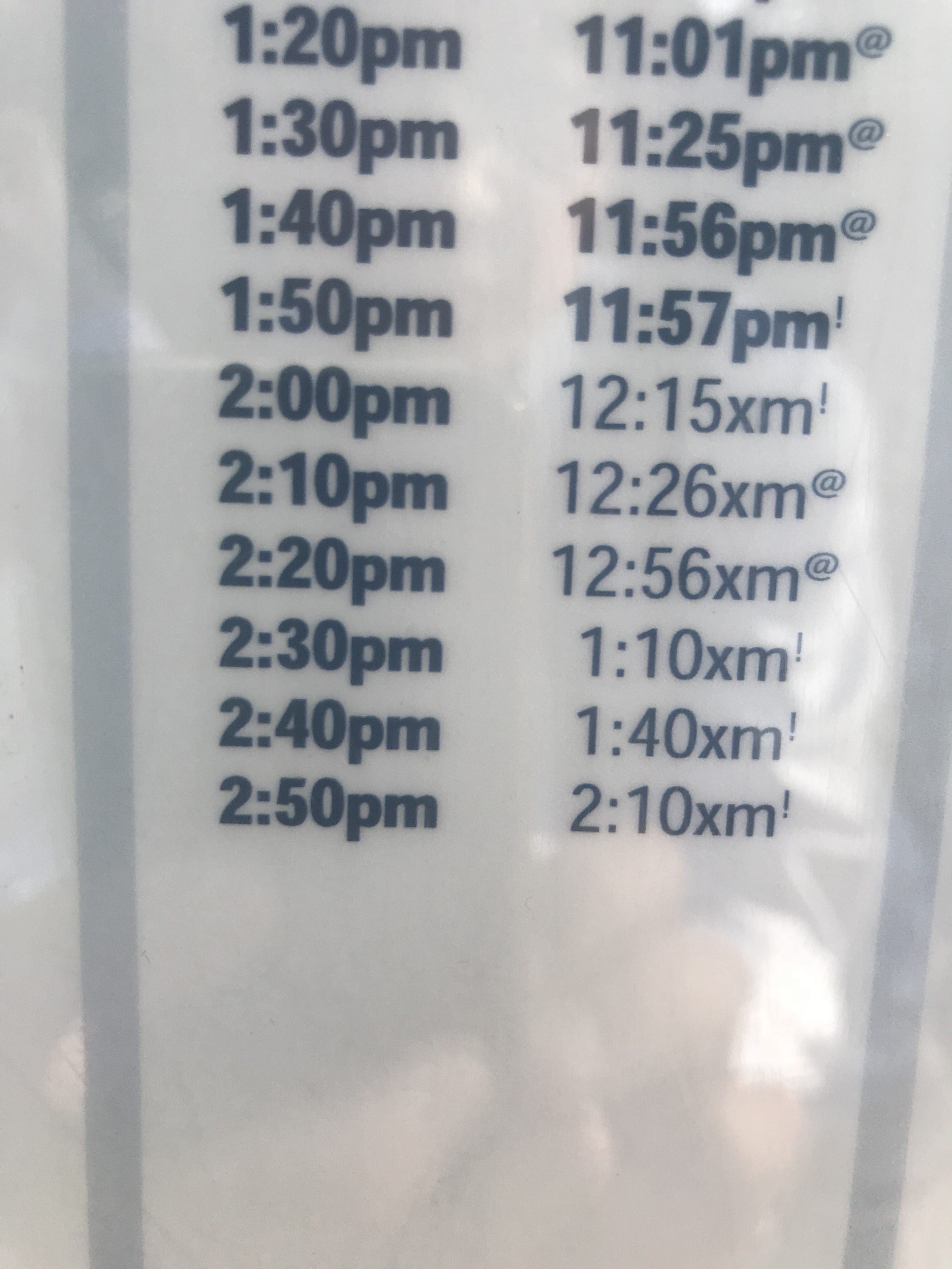 | キャンパス内のアパートからの外出にはバスを利用していたのですが、時刻表を見ておやっと思ったのが「xm」という単語です。 どうも24時をすぎた真夜中をamと書かずにxmと書くようです。 これは英語圏では一般的な用法なのでしょうか…? |