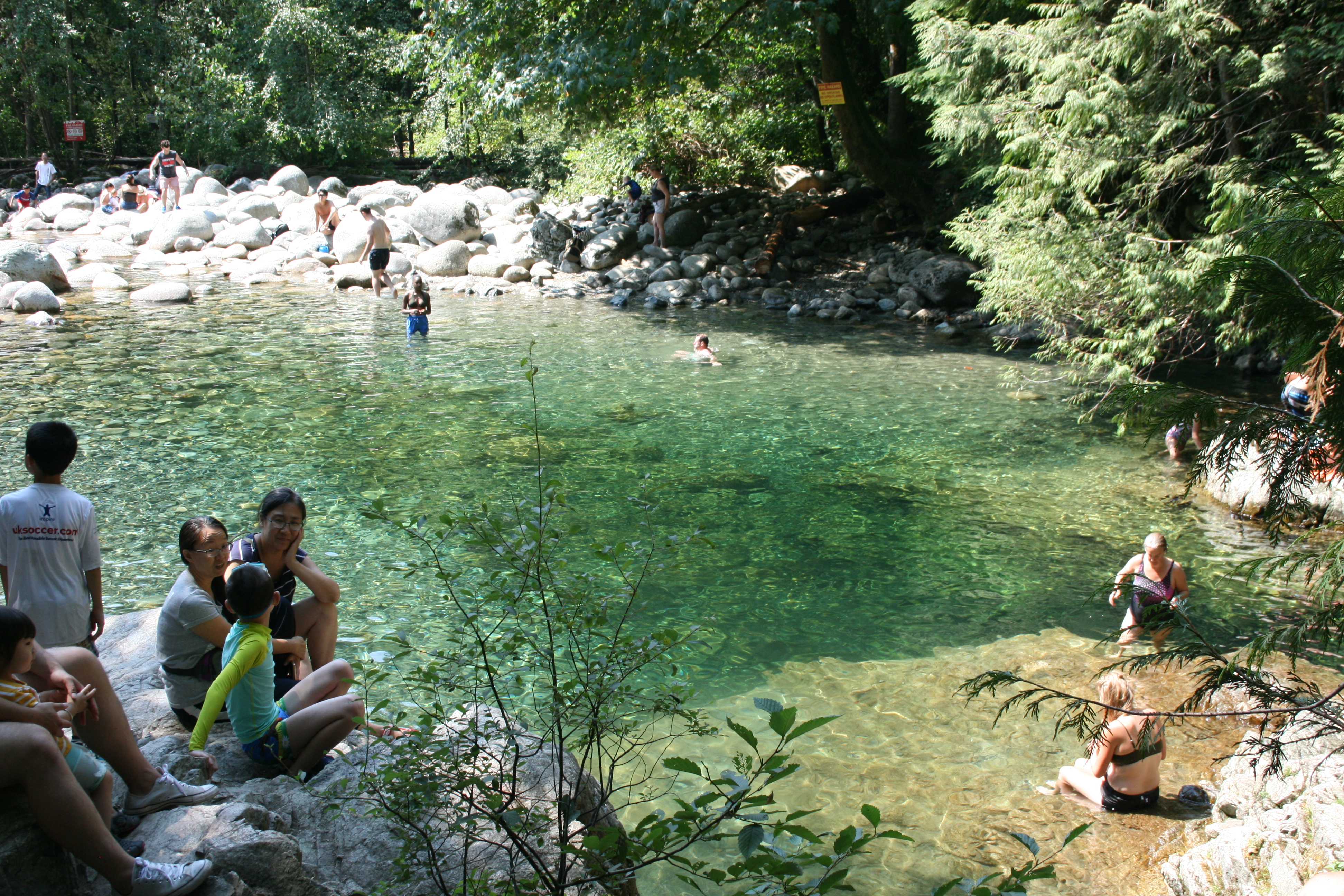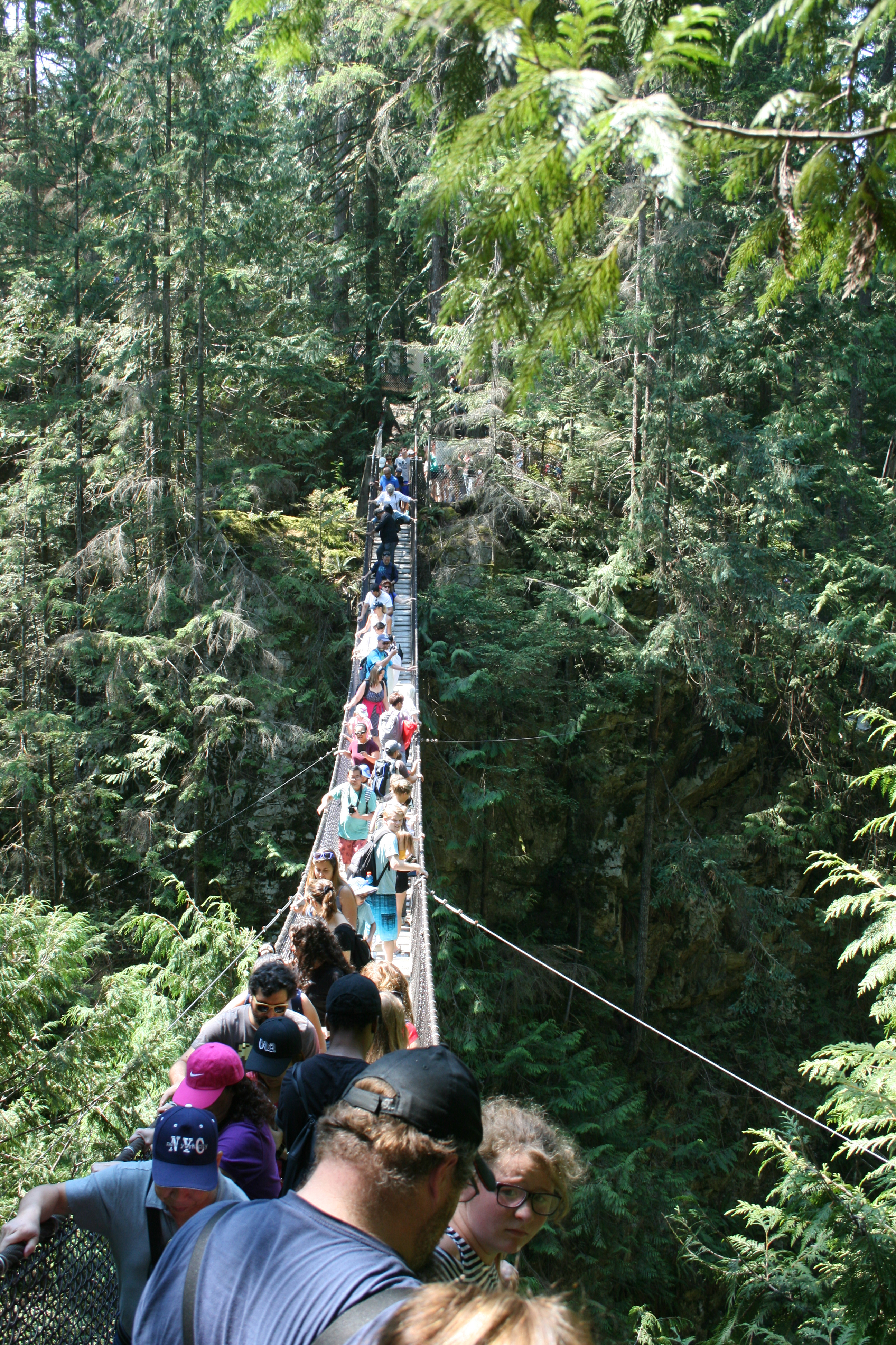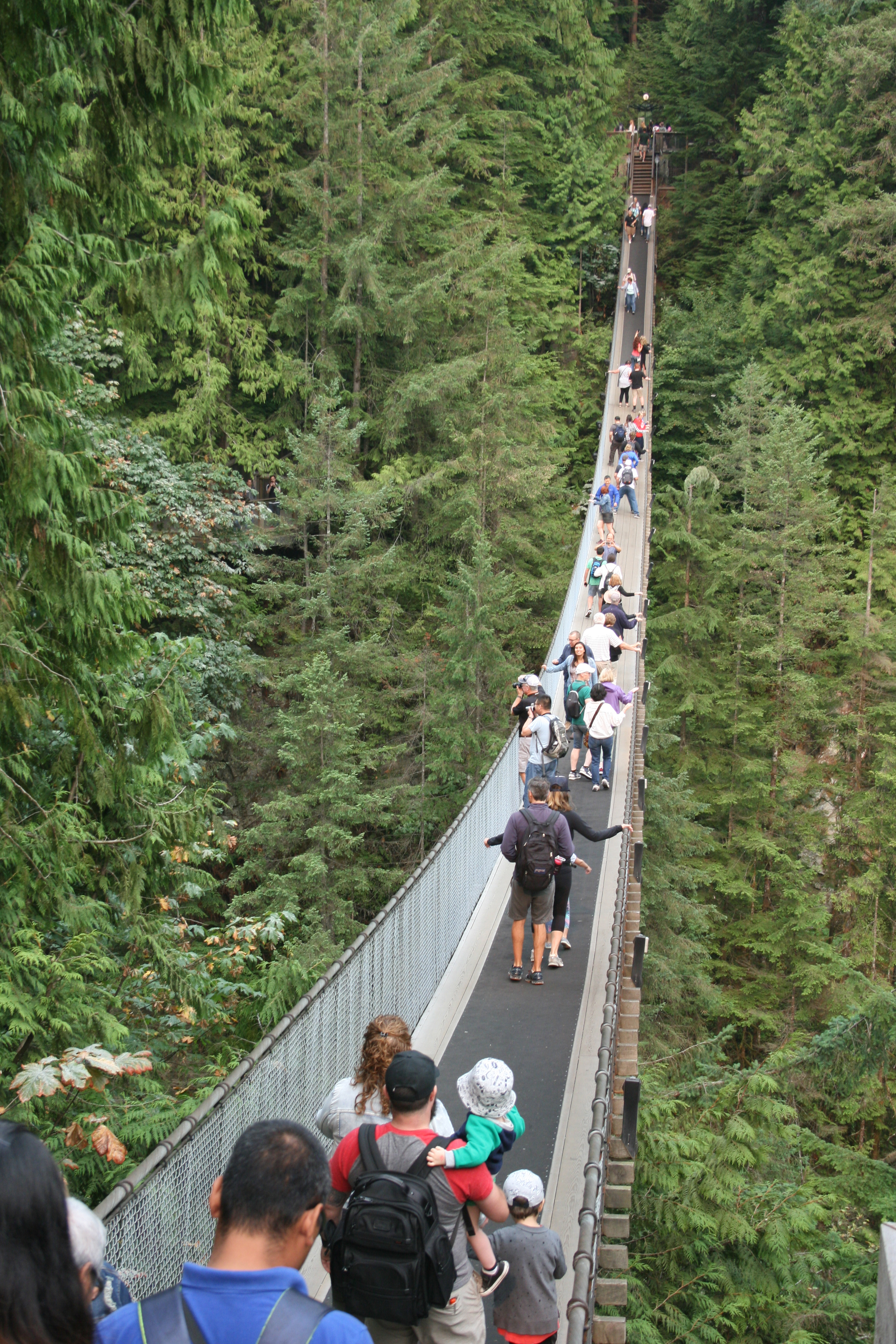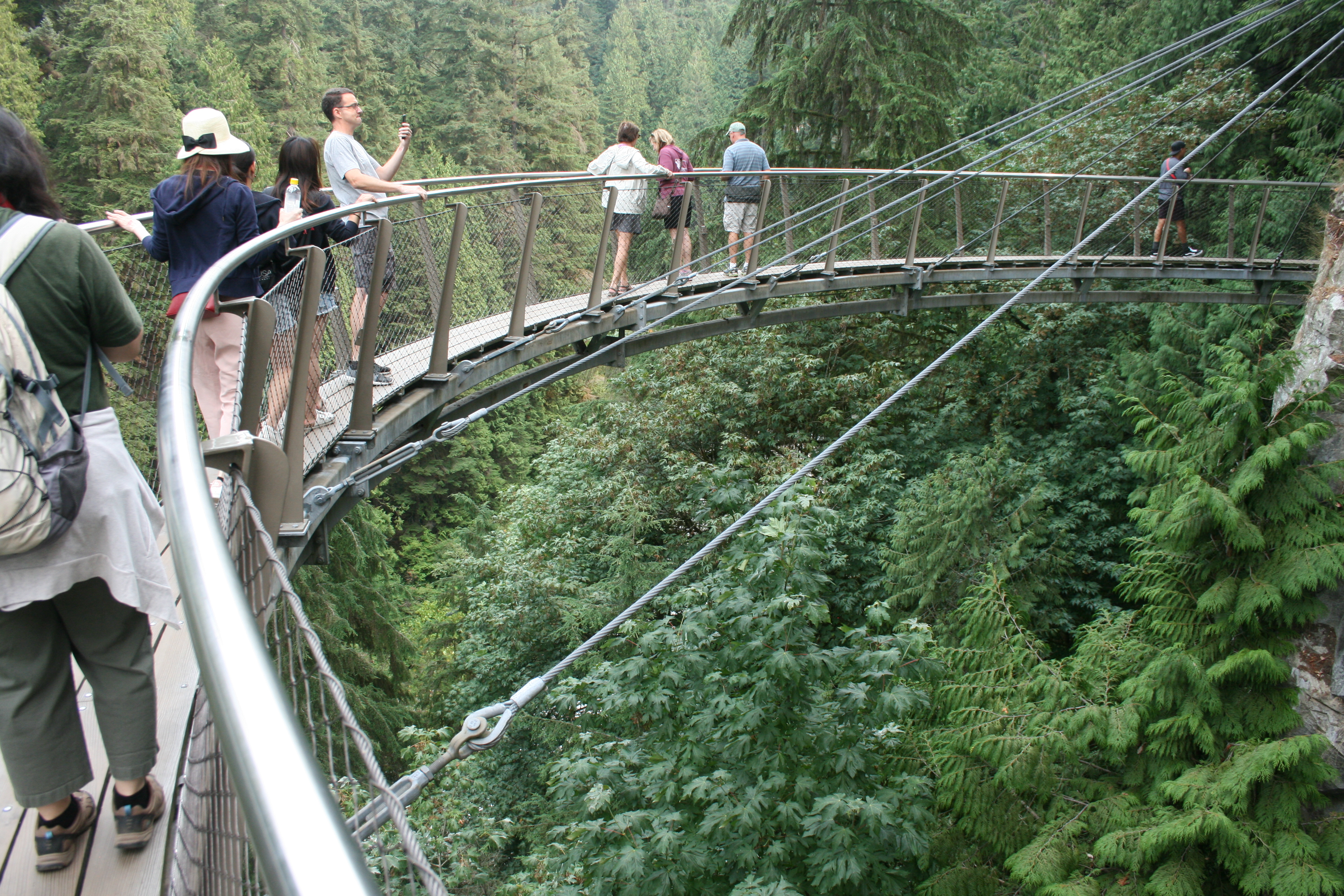 | ダウンタウンから北にバスで20〜30分ほど足を伸ばすと、森に囲まれた豊かな自然を楽しむことができます。 写真上段はリン渓谷のつり橋と水たまり、下段はキャピラノ渓谷のつり橋と遊歩道です。 |