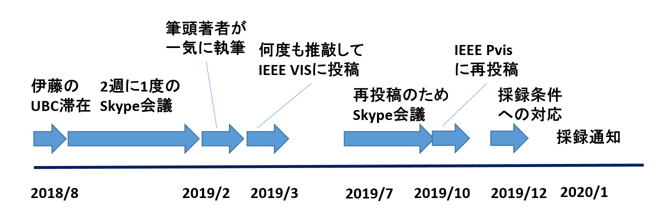 IEEE VISの投稿期限は例年3月末です。一方で、筆頭著者は旧正月のために2月から3月初旬にかけて1カ月くらい帰省することになりました。その間はSkypeでの議論は一時停止となったのですが、筆頭著者はその間に大幅に実装を進め、さらに論文の初稿も書いていました。3月に入ってからはオンラインで共著者が何度も校正しあい、さらに筆頭著者の研究室では投稿前にメンバーに論文を読んでもらってゼミで質疑を交わす、という形で入念に推敲を進めました。